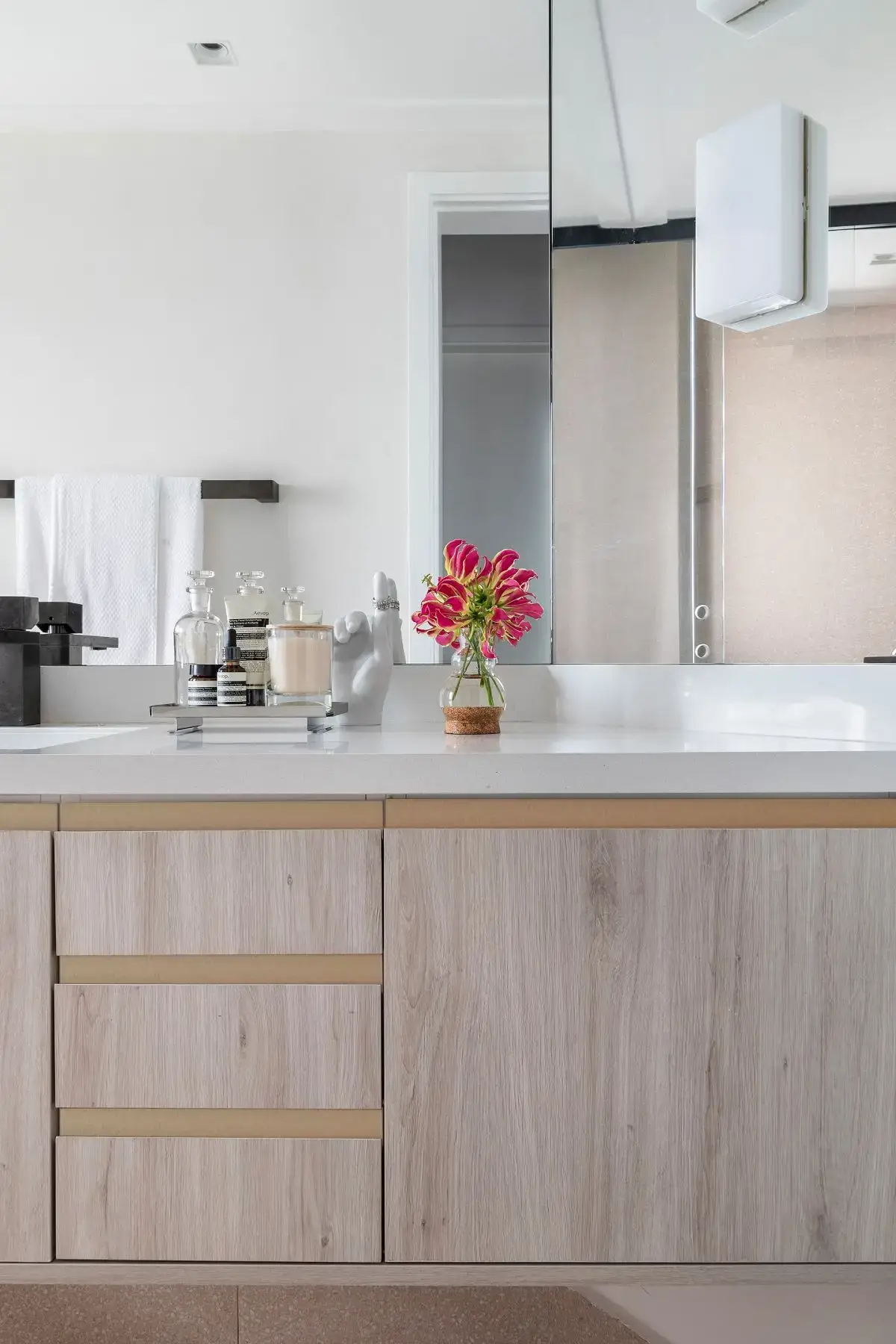 O ambiente recebeu o mesmo revestimento da cozinha, um porcelanato granilite em tom rosê, só que diferente da cozinha, sai o armário branco e entra uma madeira mais clara. Para isso, a estrutura em MDP branco recebeu portas Star Naturalle com 18mm, puxador anodizado rosê e corrediças telescópicas em inox com amortecimento, que permitem um fechamento mais suave.