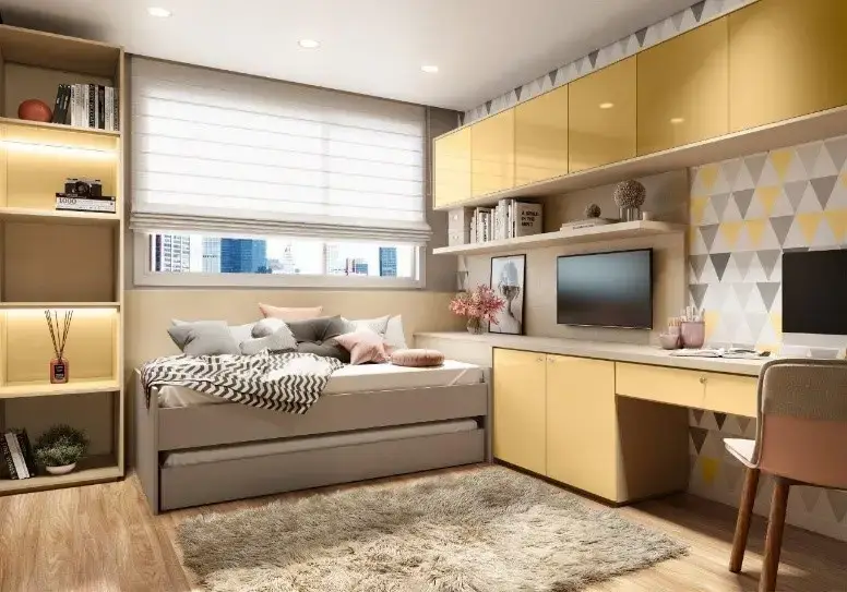 Amarelo: aguça a curiosidade, felicidade, atenção e otimismo. Utilizado no home office ou no dormitório infantil, estimula ainda mais o intelecto e a criatividade.