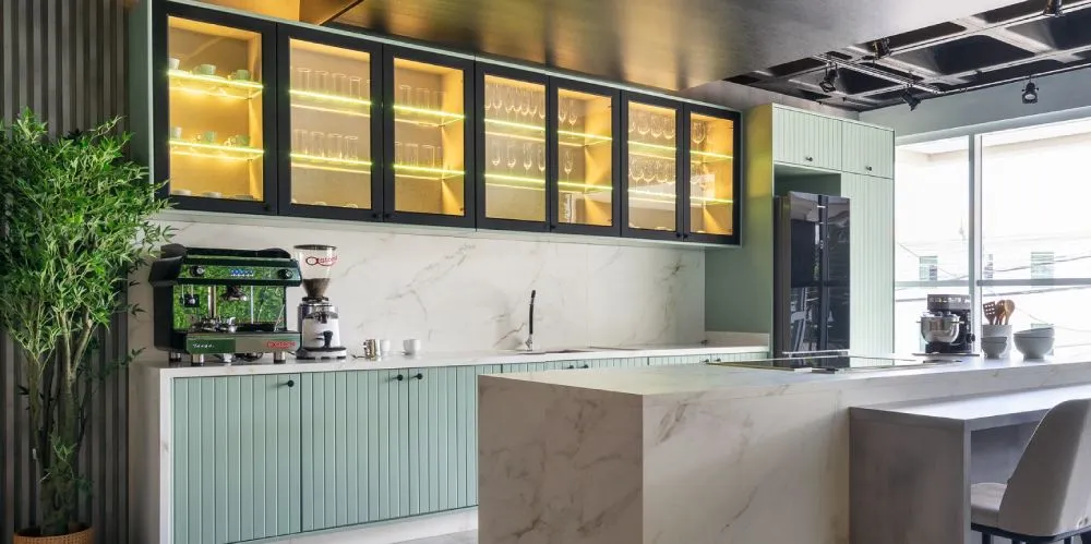 A versatilidade do vidro valorizando ilhas e bancadas em pedra.