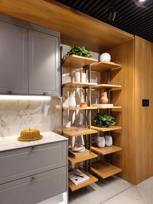 As prateleiras assimétricas, como na imagem abaixo, rompem com a monotonia, criando um espaço dinâmico onde cada nível serve de palco para diferentes narrativas. Esta abordagem não apenas otimiza o espaço, mas também reflete um estilo de vida onde a cultura do design moderno é celebrada na disposição harmoniosa de objetos, plantas e literatura.
