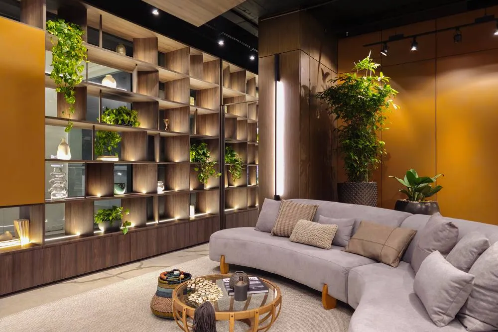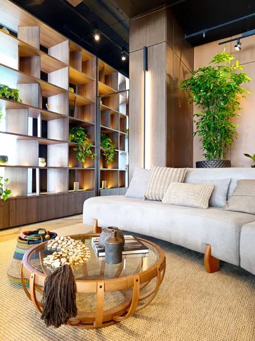 Em nossa última parada, chegamos a um espaço onde os móveis da Criare são mais do que meros objetos; são participantes ativos de um estilo de vida. A estante ao fundo, com sua simetria elegante e nichos que acolhem o verde, é a prova de que um ambiente bem planejado pode unir design, conforto e natureza em uma harmonia que é tanto funcional quanto bela, criando um oásis de tranquilidade e cultura.