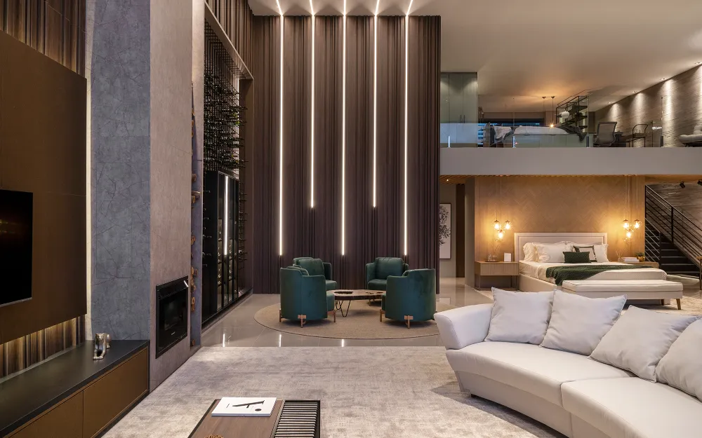 O impacto dos materiais e estilos escolhidos é evidente no espaço destacado pela foto do Showroom Criare. A madeira nas paredes traz uma textura quente que complementa os tons neutros e suaves do mobiliário. A inserção sutil de cores, como o verde das poltronas ao fundo, adiciona vida e personalidade sem sobrecarregar o ambiente.