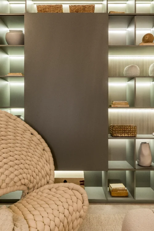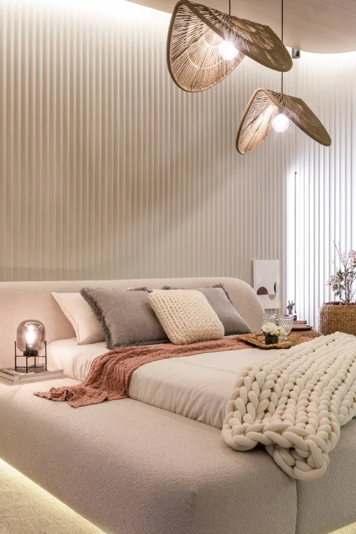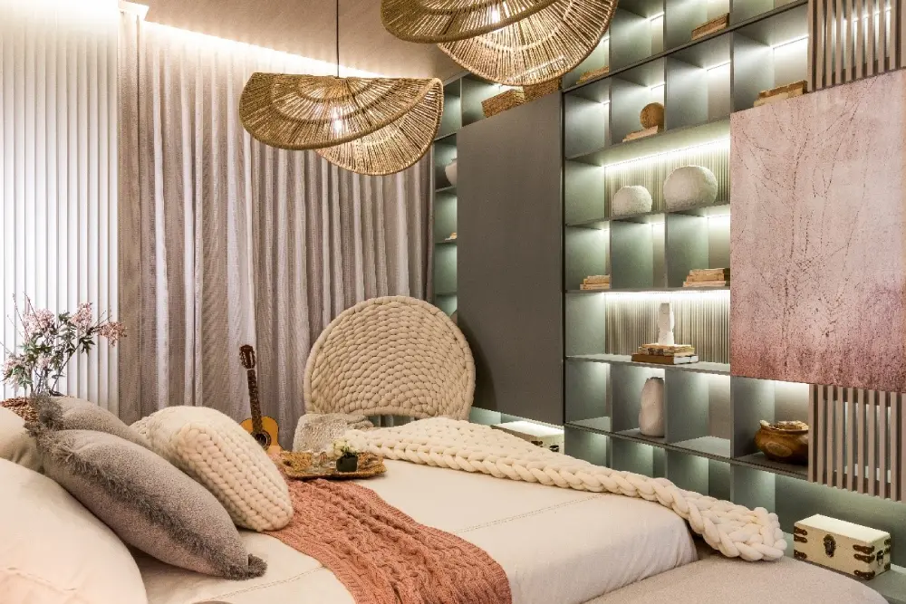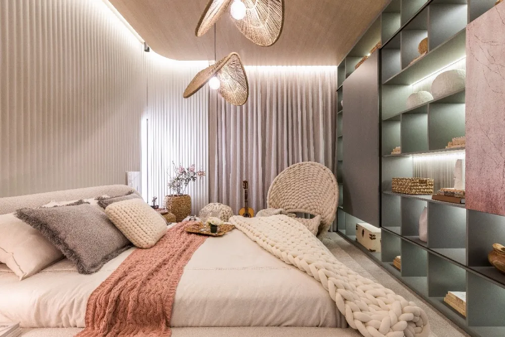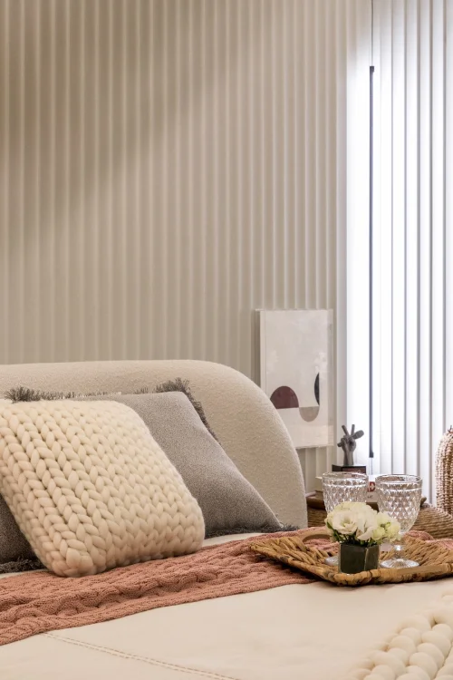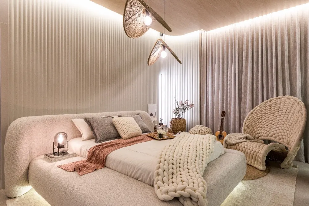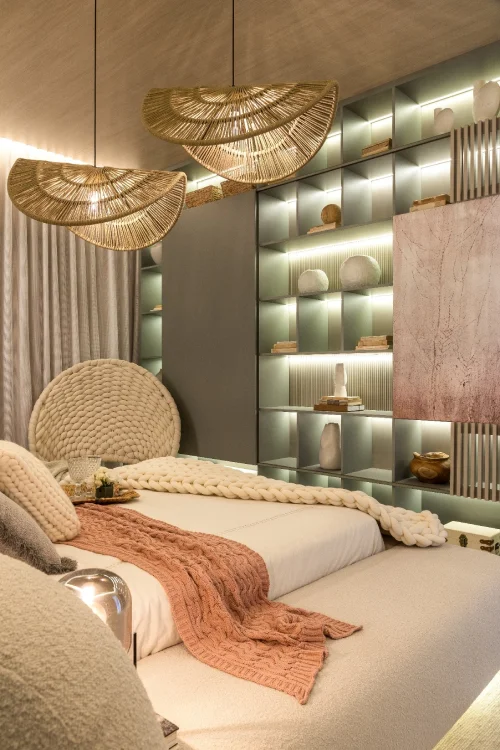 A Criare contribuiu com soluções personalizadas, destacando sua flexibilidade ao oferecer opções versáteis e não limitadas ao modular. A cabeceira com uma forma orgânica e fluida é um ponto focal do projeto, enquanto a estante com ripados finos realça a estética do ambiente.