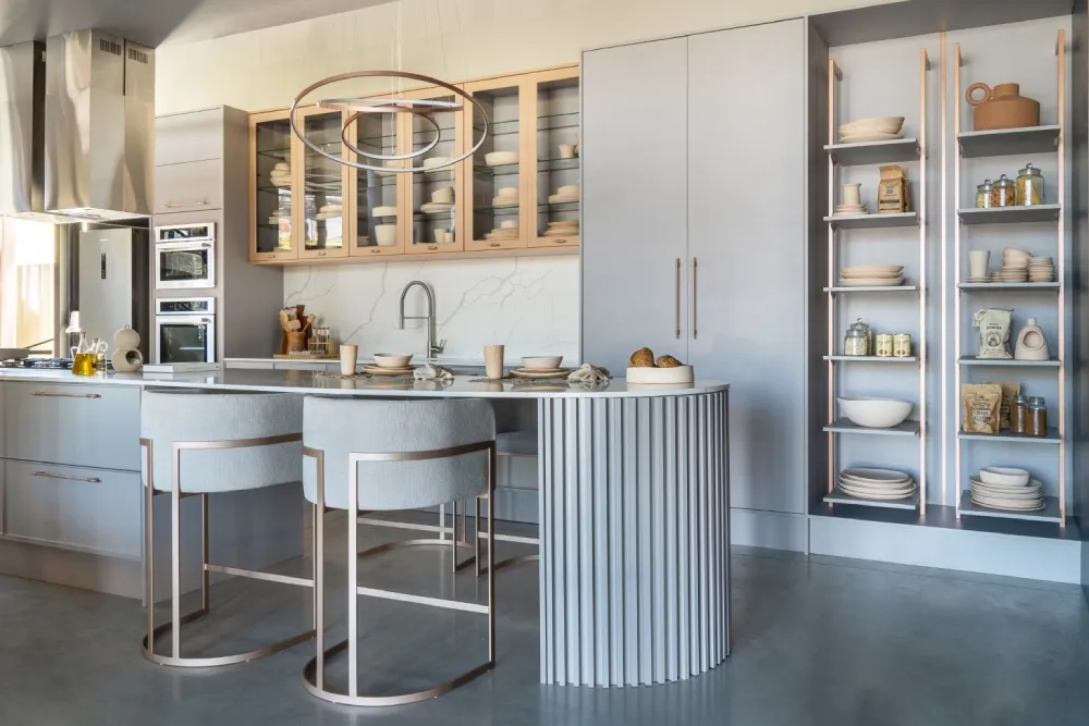 Uma ilha central pode servir como espaço extra para preparo de alimentos, armazenamento e refeições rápidas.