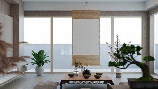Em uma casa de campo, um espaço zen pode ser em uma varanda fechada, aproveitando a vista para o jardim. Móveis planejados em bambu são utilizados para harmonizar com o ambiente natural: um tatame cobre o chão, proporcionando uma base confortável para a prática de meditação e nichos embutidos nas paredes armazenam incensos e livros sobre mindfulness.