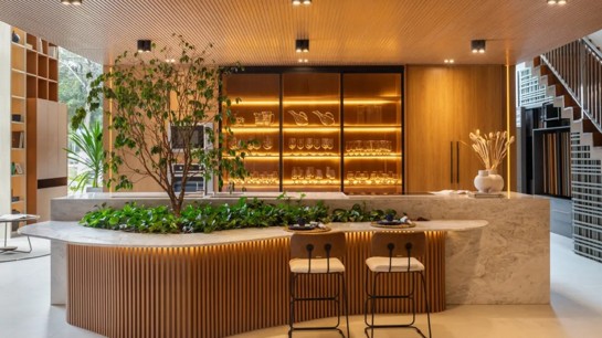 Cozinhas biofílicas: madeira natural e vegetação para um espaço acolhedor e sustentável. Fotógrafo: Rogério Vaz