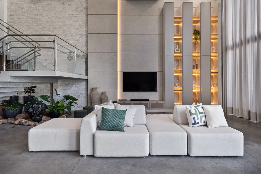 Os móveis planejados biofílicos incorporam madeira certificada, bambu e pedras naturais, promovendo um visual sofisticado e sustentável. Além disso, os tons claros são cada vez mais utilizados para reforçar a sensação de amplitude e aconchego nos ambientes.